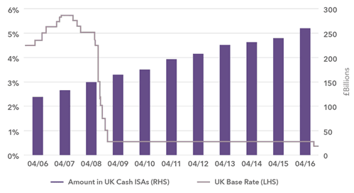 Today, inflation in the UK stands at 1.8% meaning even the best cash ISA will be likely to lose money in real terms. With the recent fall in Sterling against other currencies, inflation expectations are in the 3-4% range over the next couple of years. If ISA rates don’t pick up (and there is little sign they will), savers could be losing 2-3% a year. Someone who had amassed £30,000 in cash ISAs could be losing £1,000 a year just by holding money in a cash ISA.